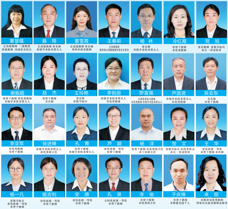 硬核配置:一线教师126人。其中,正高级教师4人,特级教师3人,教育部专家1人,省教育厅专家6人,河南省名师11人,河南省名班主任5人,中高级职称教师111人,省市级名师、骨干教师、学术技术带头人占比超三分之二;近三年,在各级各类优质课比赛中,获得全国奖10余人次,省一二等奖30余人次;每一位教师,都是“教书匠”,更是“引路人”。
